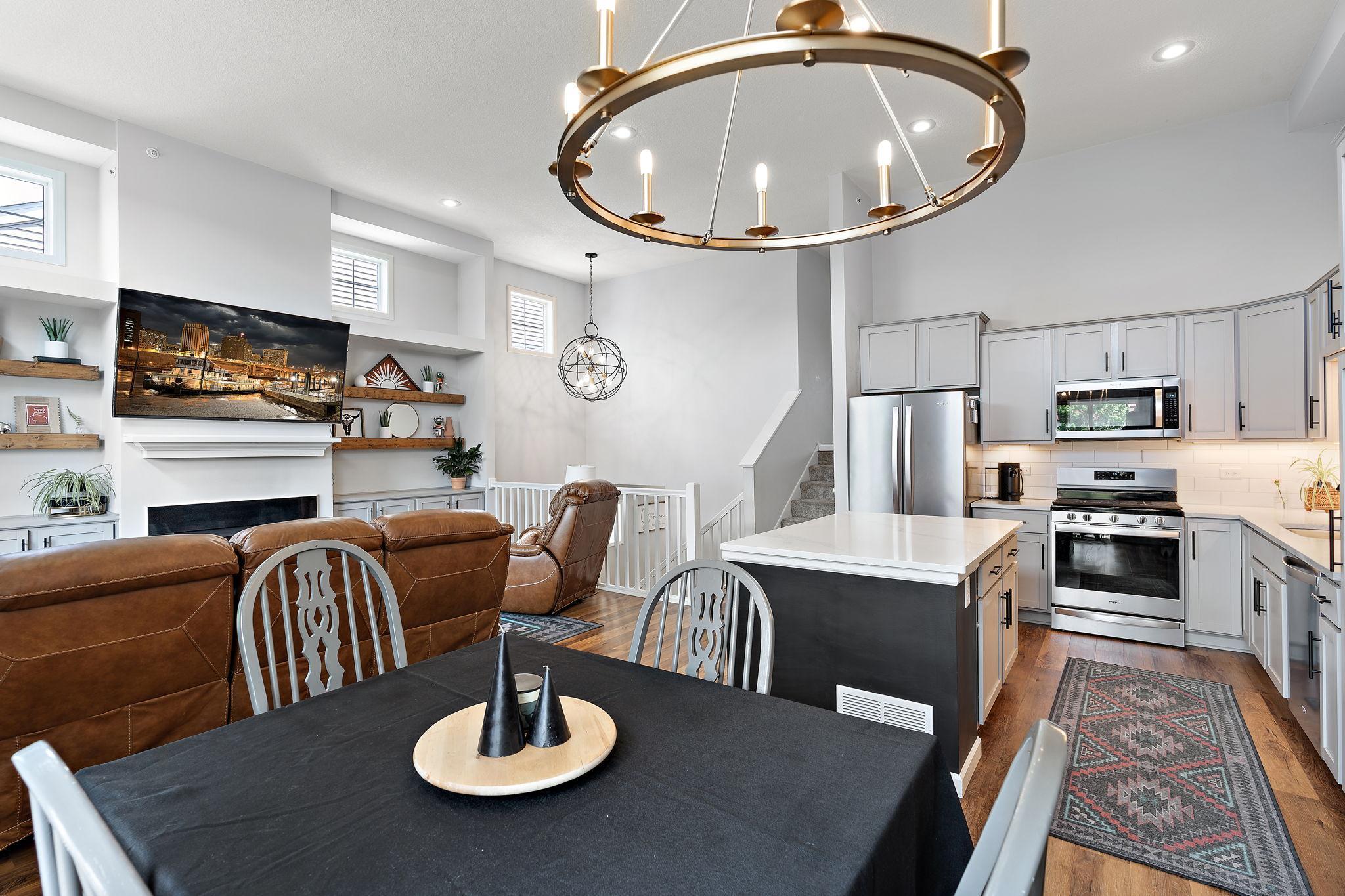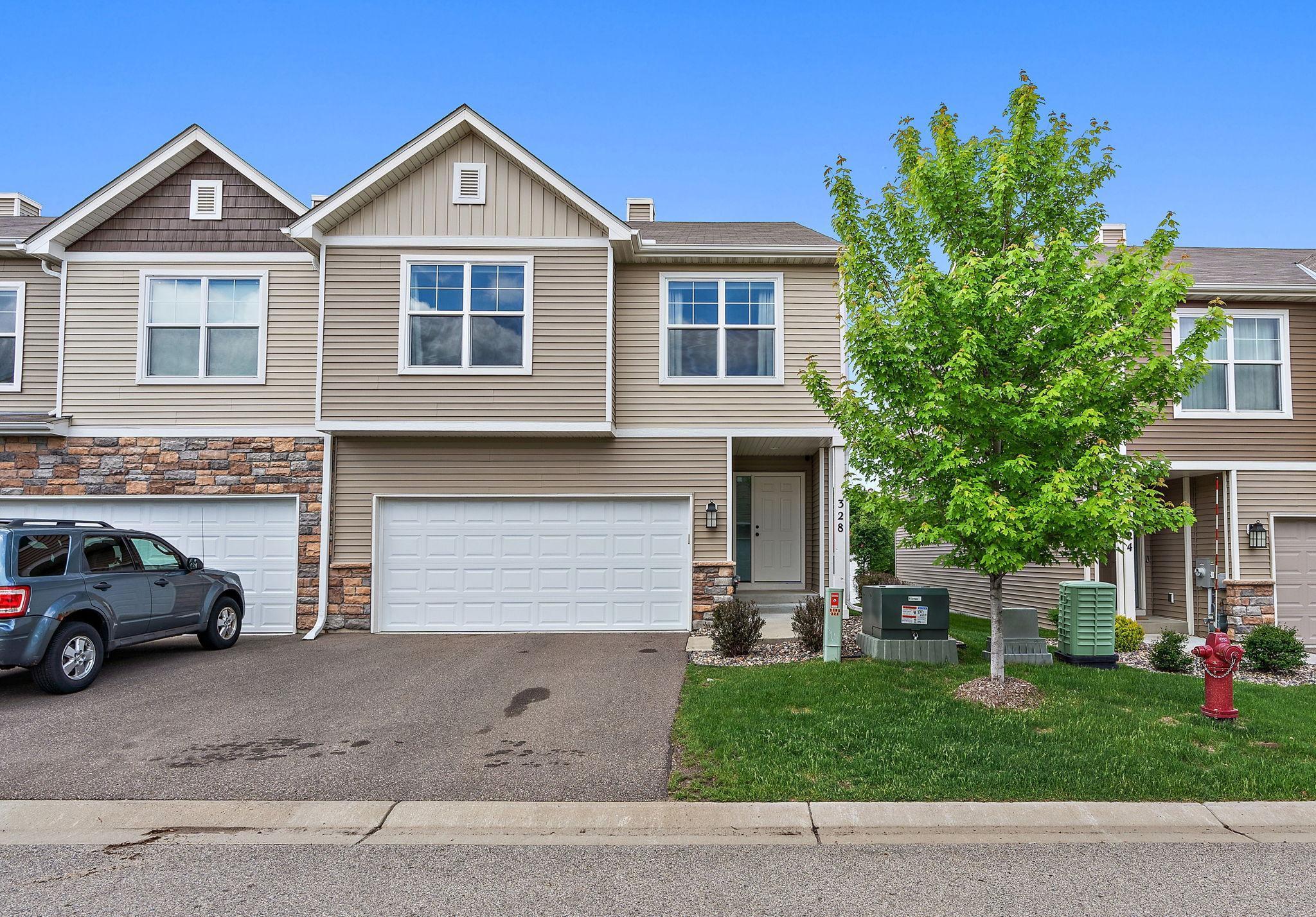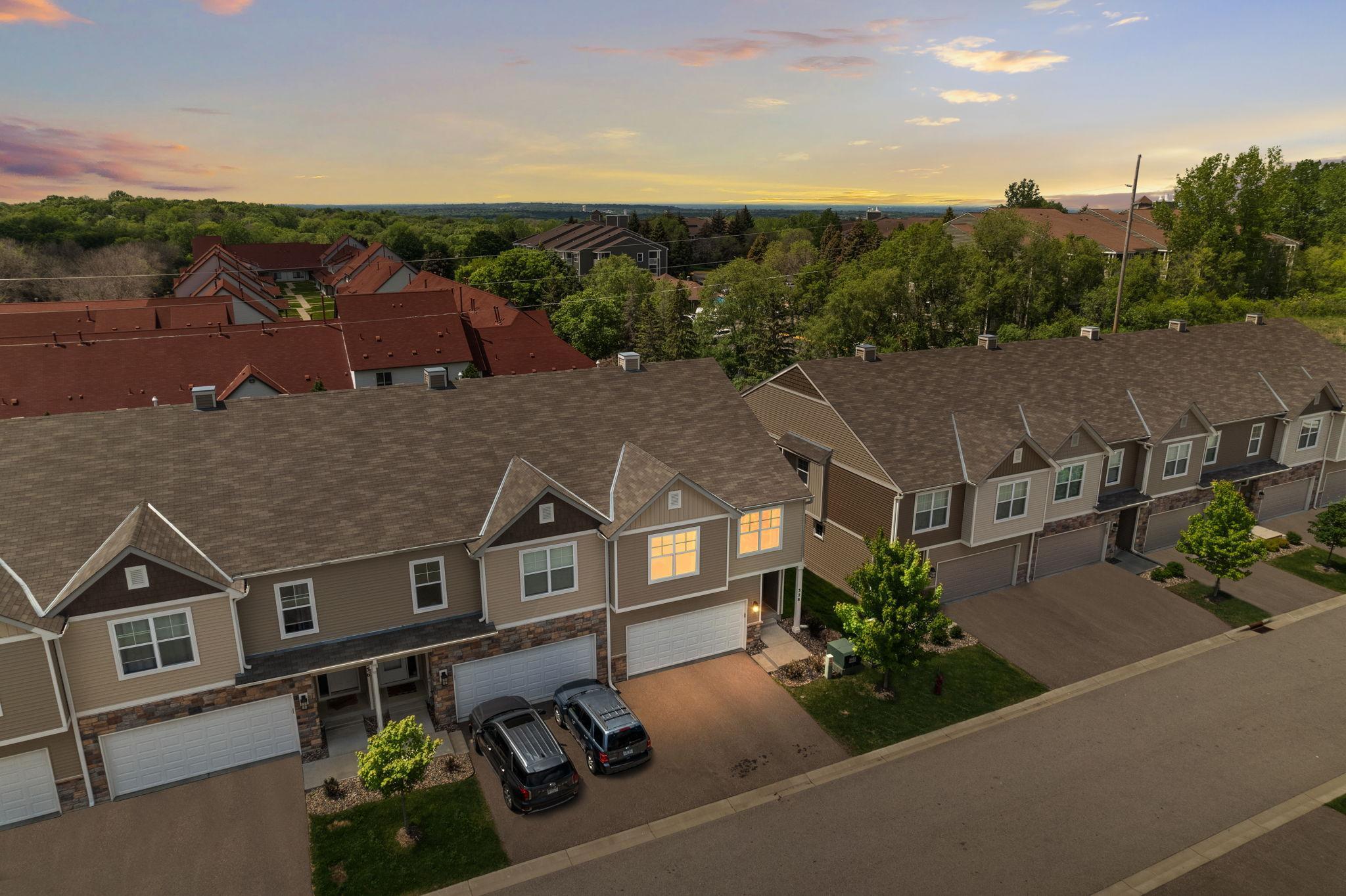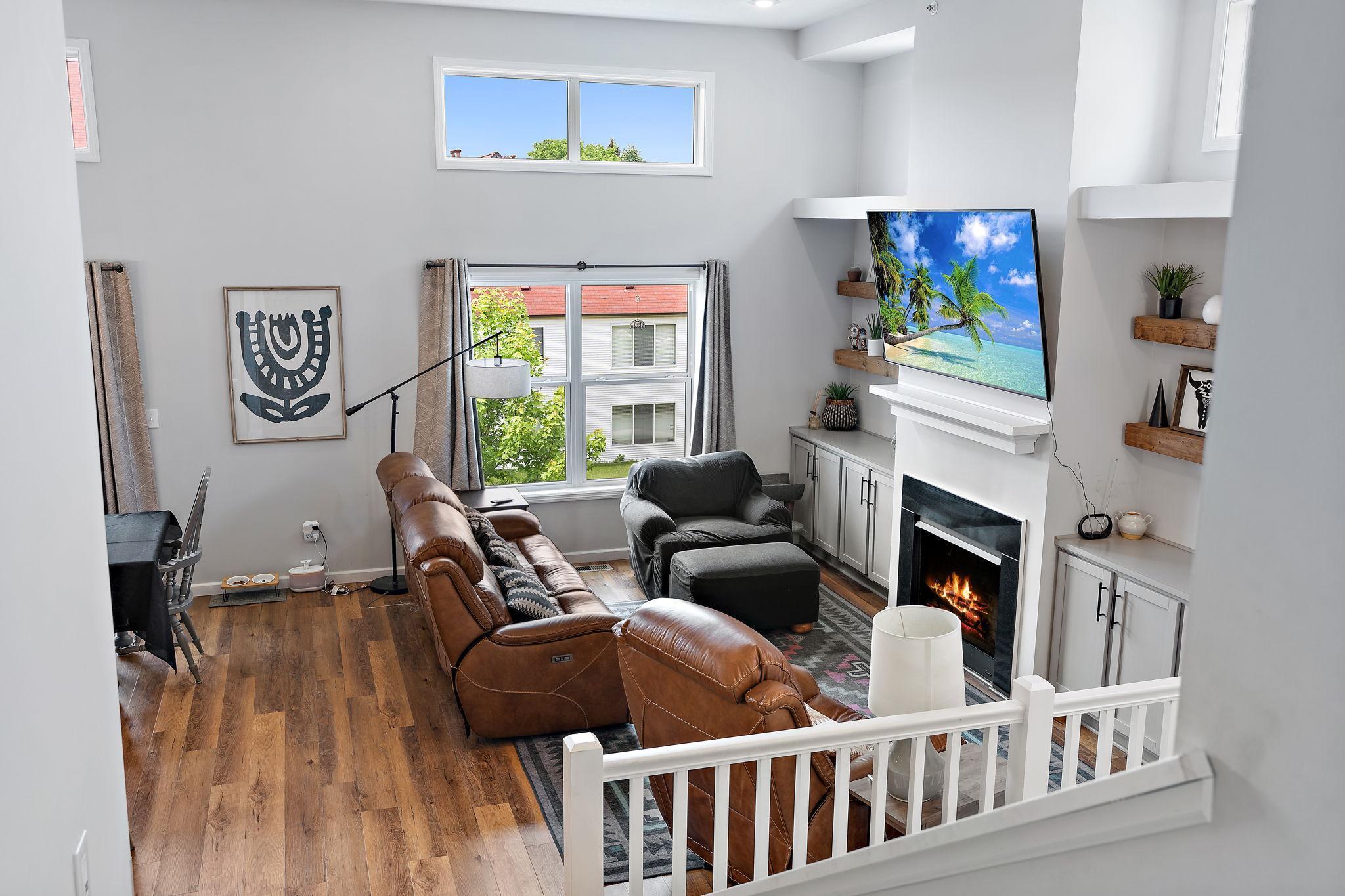This beautifully upgraded end unit townhome, built in 2019 features soaring 13 Ft. ceilings throughout the main level with LVP flooring that seamlessly flows from room to room. The kitchen features stainless steel appliances, subway tile backsplash, quartz countertops, and a huge center island. Natural light floods the living spaces from perfectly placed transom windows, creating a bright and inviting ambiance. Cozy up by the gas-burning fireplace in the main level living room, complete with built-in cabinetry for added charm and functionality. Retreat to the primary bedroom, featuring a spacious walk-in closet and a private owner's suite bathroom complete with double sinks, a walk-in shower, and a soaking tub with custom tile surround. Downstairs, the walkout basement expands the living space with a family room, additional bedroom, full bathroom, and extended patio slab.. Conveniently located close to shopping, restaurants, and more with easy access to 35W and 35E!