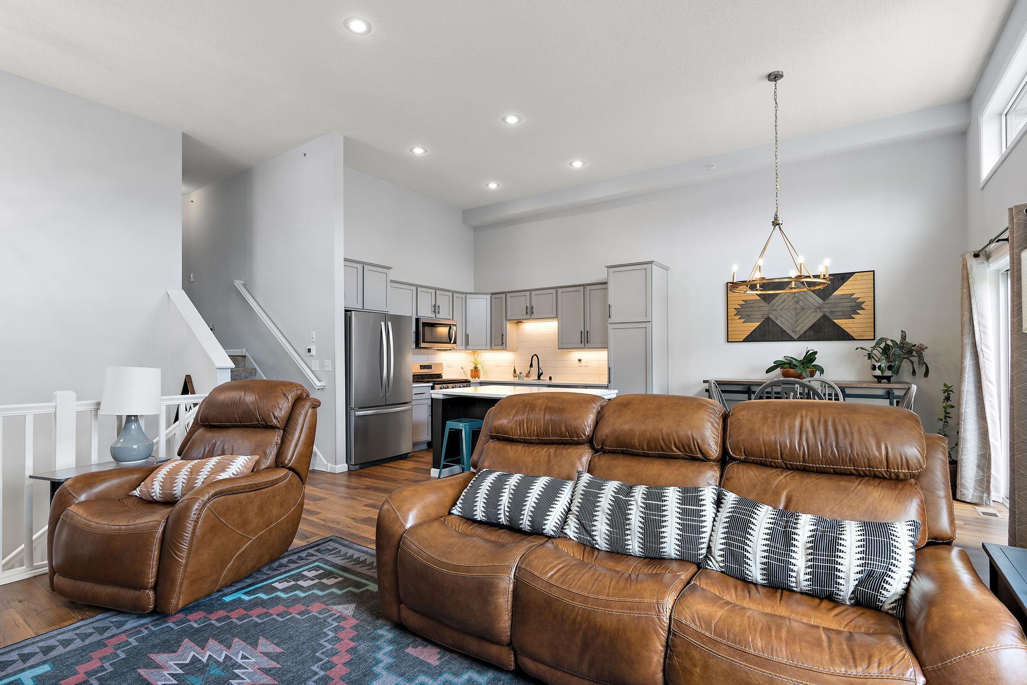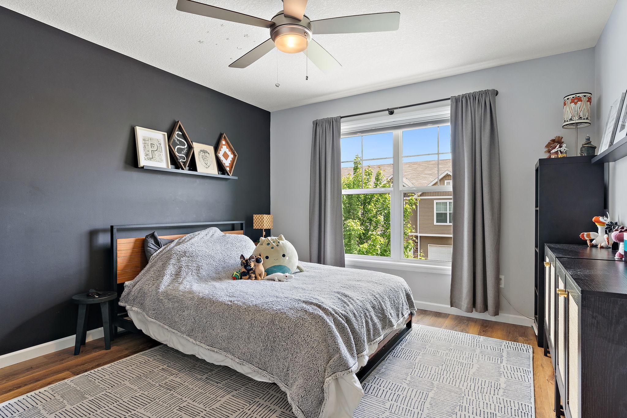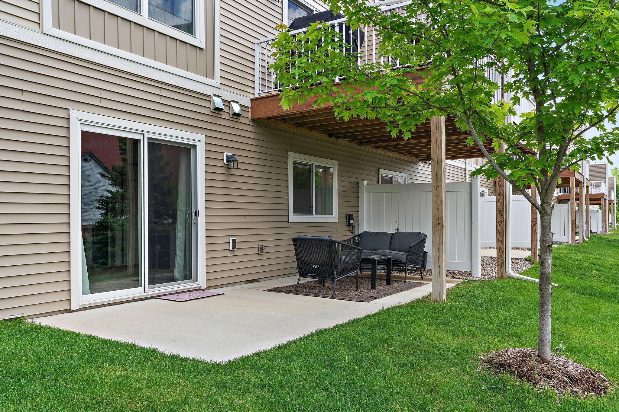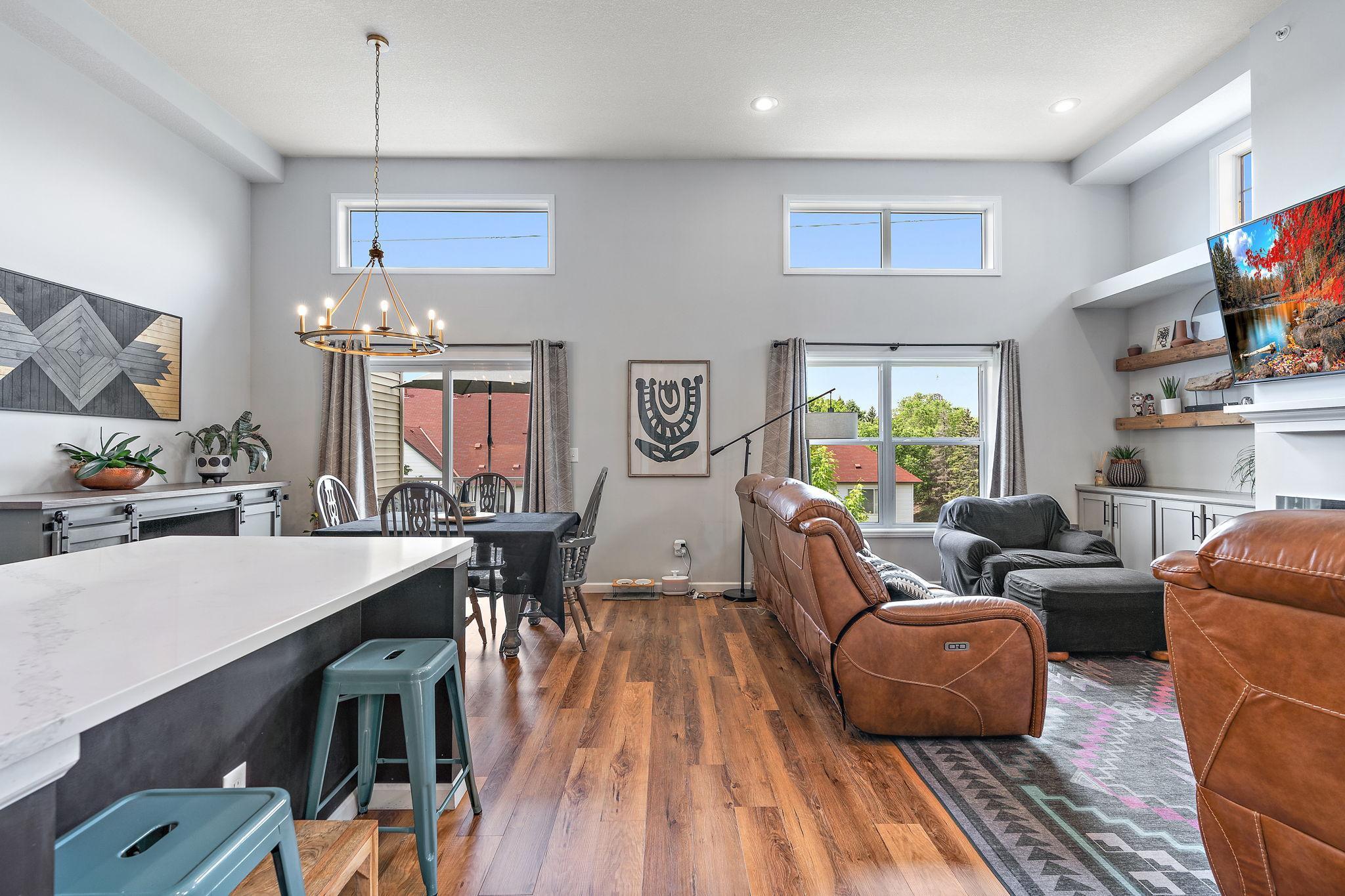 This beautifully upgraded end unit townhome, built in 2019 features soaring 13 Ft. ceilings throughout the main level with LVP flooring that seamlessly flows from room to room. The kitchen features stainless steel appliances, subway tile backsplash, quartz countertops, and a huge center island. Natural light floods the living spaces from perfectly placed transom windows, creating a bright and inviting ambiance. Cozy up by the gas-burning fireplace in the main level living room, complete with built-in cabinetry for added charm and functionality. Retreat to the primary bedroom, featuring a spacious walk-in closet and a private owner's suite bathroom complete with double sinks, a walk-in shower, and a soaking tub with custom tile surround. Downstairs, the walkout basement expands the living space with a family room, additional bedroom, full bathroom, and extended patio slab.. Conveniently located close to shopping, restaurants, and more with easy access to 35W and 35E!
