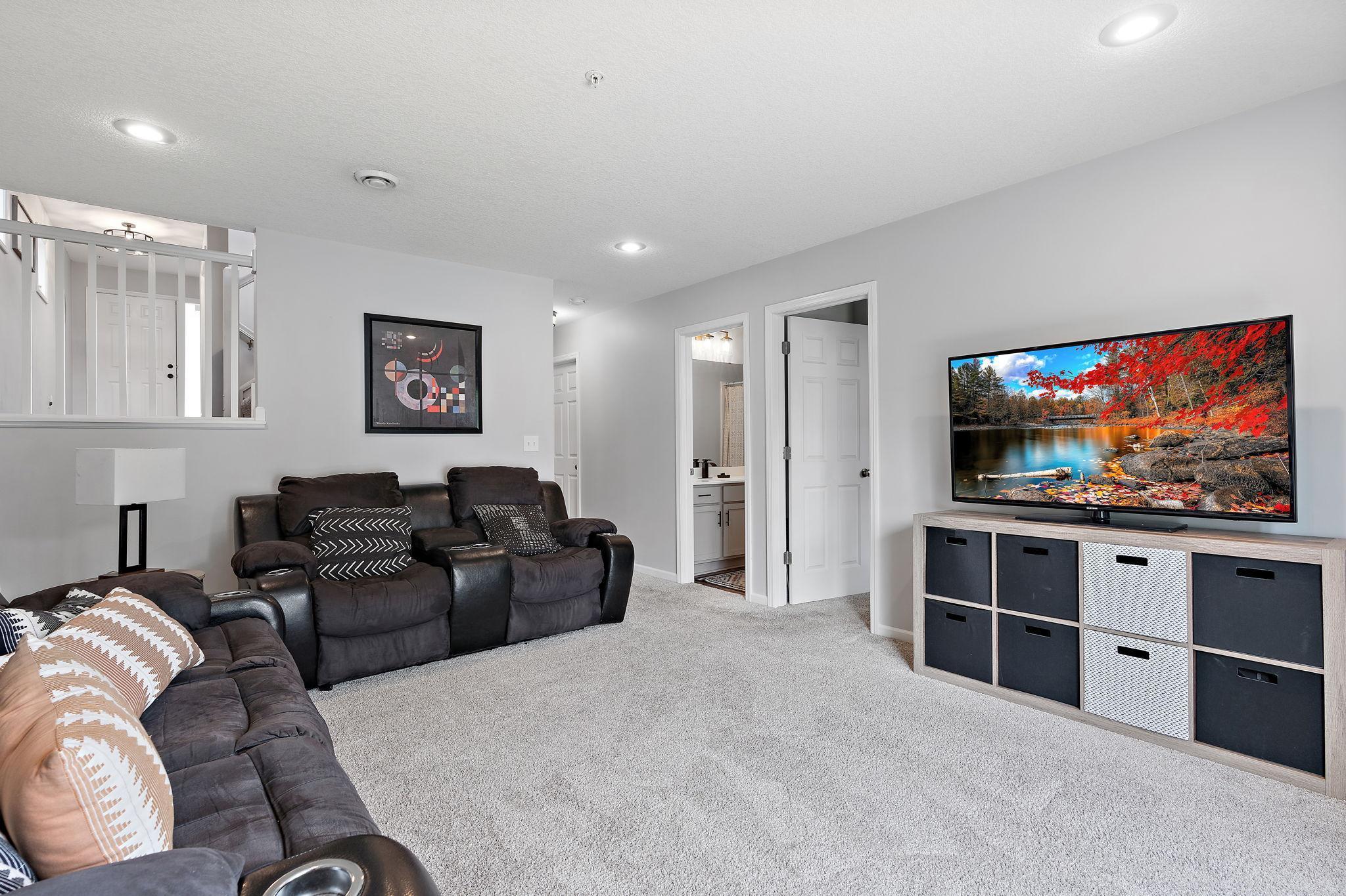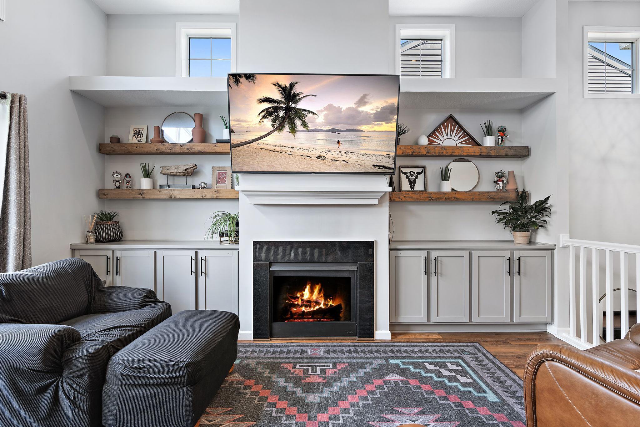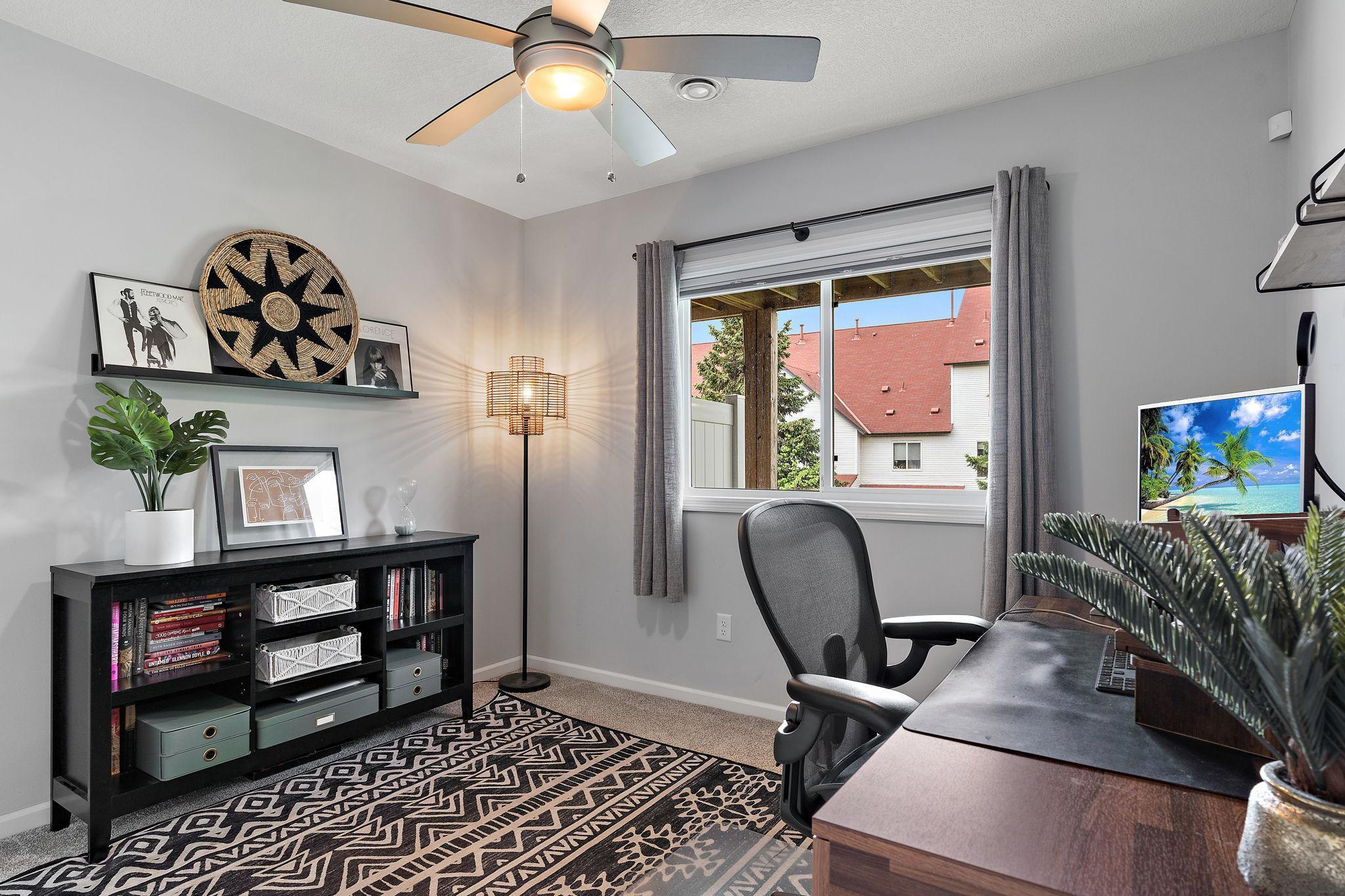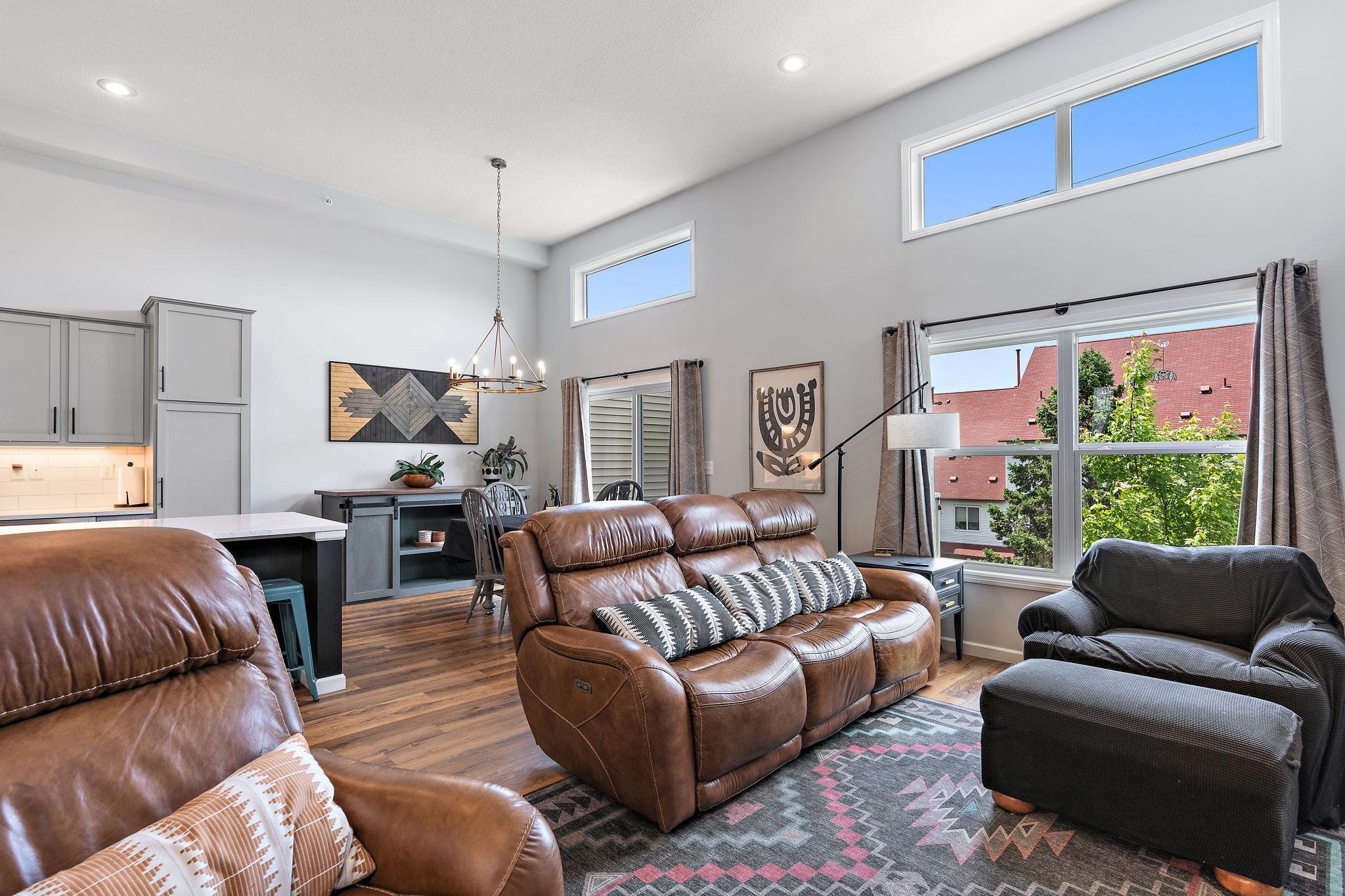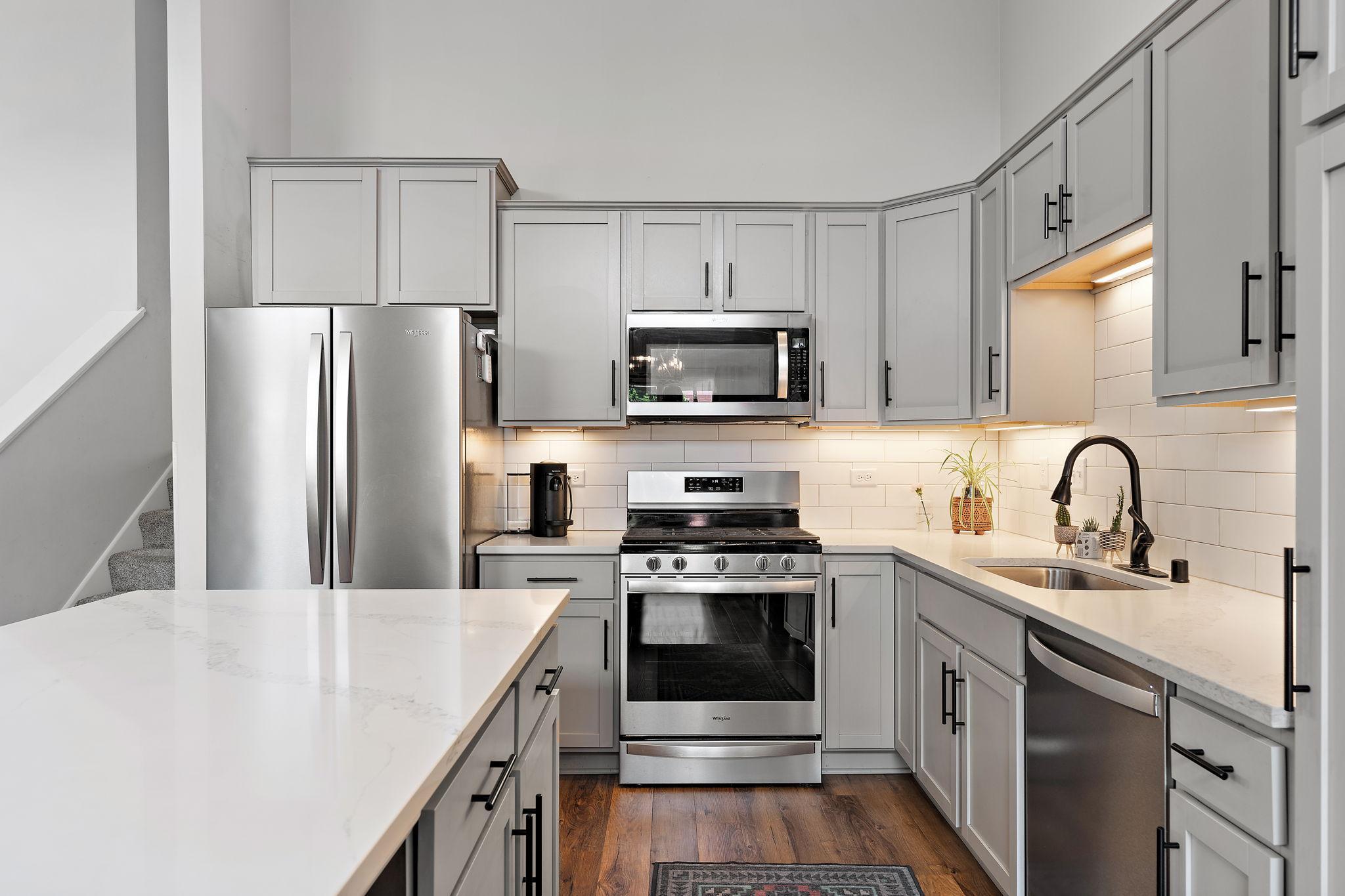 This beautifully upgraded end unit townhome, built in 2019 features soaring 13 Ft. ceilings throughout the main level with LVP flooring that seamlessly flows from room to room. The kitchen features stainless steel appliances, subway tile backsplash, quartz countertops, and a huge center island. Natural light floods the living spaces from perfectly placed transom windows, creating a bright and inviting ambiance. Cozy up by the gas-burning fireplace in the main level living room, complete with built-in cabinetry for added charm and functionality. Retreat to the primary bedroom, featuring a spacious walk-in closet and a private owner's suite bathroom complete with double sinks, a walk-in shower, and a soaking tub with custom tile surround. Downstairs, the walkout basement expands the living space with a family room, additional bedroom, full bathroom, and extended patio slab.. Conveniently located close to shopping, restaurants, and more with easy access to 35W and 35E!