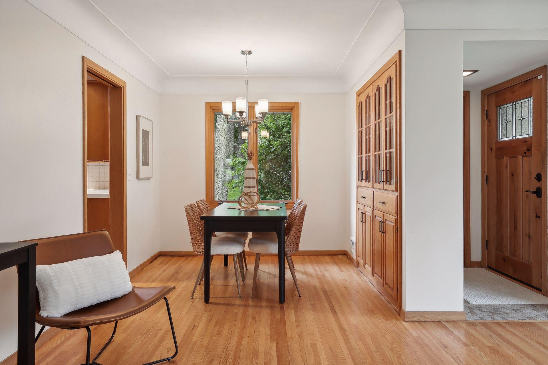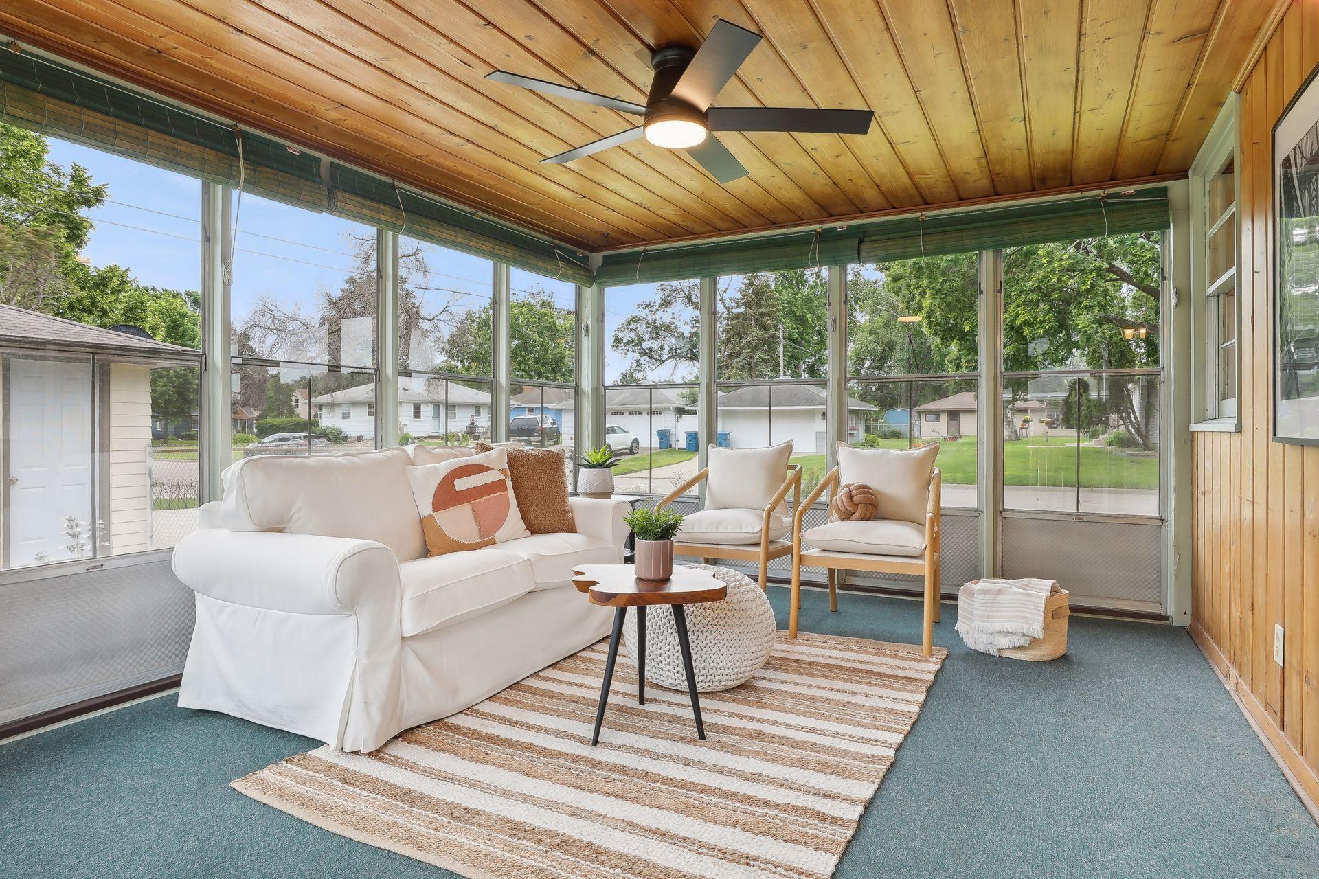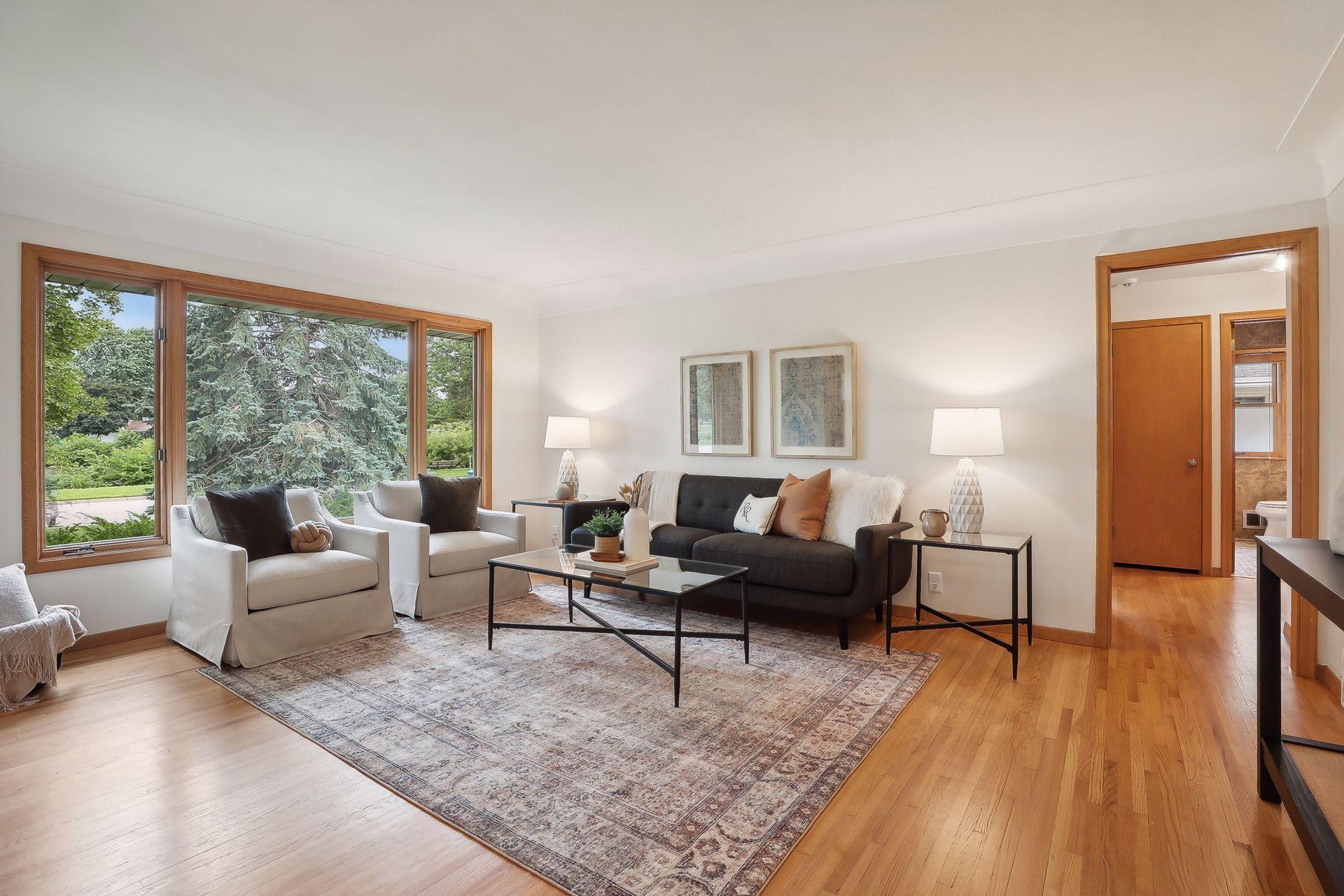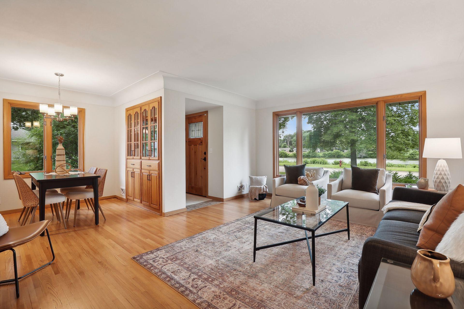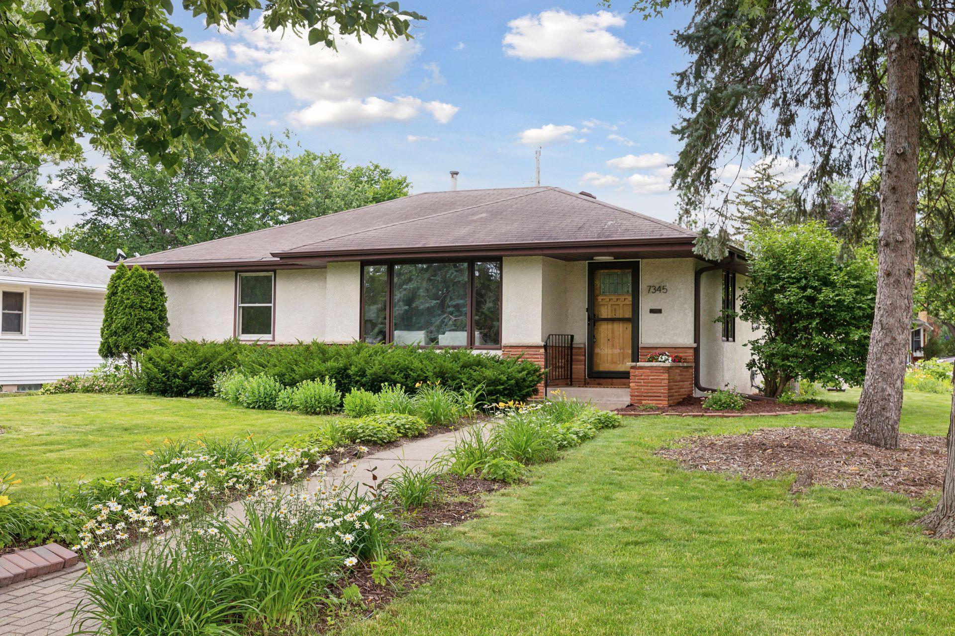 Welcome to 7345 15th Ave S, Richfield, MN! This beautiful 1950s rambler sits on a fantastic corner lot, right across from a serene pond. Enjoy wonderful sunset views and great natural light through the southwest-facing windows. Fantastic design and beautiful finishes throughout including gleaming hardwood floors, a built-in dining buffet, gorgeous front door, updated lighting, brand new carpet, and fresh paint. The stylish kitchen features new flooring, a cozy breakfast nook, abundant cabinets, new cooktop, retro exhaust hood, and a walk-in pantry. Additional main floor highlights include three bedrooms and an updated bathroom with a dual vanity and granite counters. Downstairs you'll find an expansive family room, office, a three-quarter bath, and outstanding storage. You'll love relaxing on your wonderful three-season porch overlooking the spacious patio, fenced yard, & gardens. A spacious two car garage has room for vehicles and more. This gem is in turnkey condition--move right in!